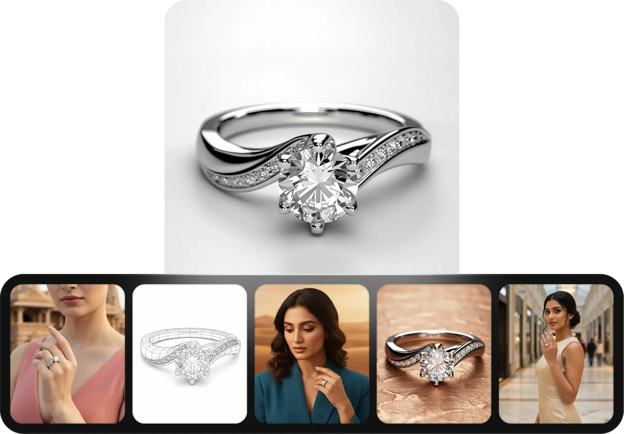 From AI jewellery model photos to complete ecommerce catalogues, everything you need to showcase your jewellery professionally.
